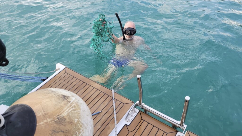 The string of buoys began to move closer to the boat and seemed to unwind itself as the rudder was at twisted maximum to starboard. It was fascinating to see the problem resolve itself, as if guided by an unknown power. The string of buoys disappeared into the horizon. Jeff and I shrugged our shoulders. I activated the autohelm. It immediately bounced into action and steered a course to the east end of Antigua, away from the rocky shores of Barbuda. Whew! 5 a.m. rolled around as we entered Falmouth harbour uneventfully. Will went to the bow and released the anchor and 80 feet of chain. We had made it! I powered the reverse to set the anchor only to be met with a loud thudding sound as the stern of the boat vibrated as if it were trying to split itself in half. I put the engine in neutral. “There must be something wrapped around the propeller,” said Will. “Let’s have a drink to a successful trip! We’ll sort out the propellor in the morning,” I shouted. Will knocked back a couple of scotches and Jeff downed a cold beer. We made our way to our bunks and fell asleep.