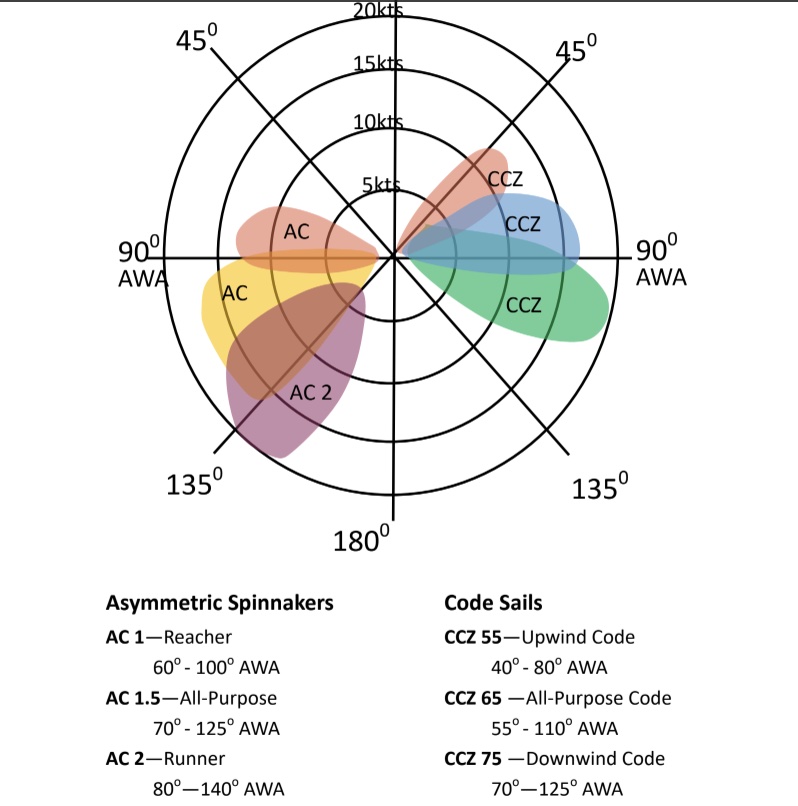 But first a little history. The first code sail, called a “code zero”, debuted during the 1997- 98 Whitbread Race and described an asymmetrical spinnaker that could sail upwind angles. Racing rules limited their design applications and even after a quarter century their design is tortured to meet the racing rules. Cruising sailors live outside the racing rules so cruising code sails, unchained from these antiquated rules, are much better sails than their racing cousins. “At Evolution Sailmakers, we’re building a wide range of what we simply call code sails to suit cruising sailors for a wide range of conditions and cruising grounds,” explains Justin Ailsworth, Jerry’s partner at Evolution Sailmakers. “But the most practical code sail for cruisers is an all-purpose one.” (More about them later!) So what is the difference between a code sail and an asymmetric spinnaker which is sometimes called a gennaker? Code sails have a cable built into the sail’s luff making them a “straight luff” sail rather than having a more elliptical “projected luff” like a spinnaker. They frequently have a sun or sacrificial cover and are rolled up with a roller furler. A code furler needs to be installed forward or outside of the usual headsail roller furler. Most modern sailboats are designed to accommodate that placement. Racing sailors might carry multiple code sails for a variety of wind conditions, but that isn’t practical for cruisers. Evolution’s all-purpose code sail is meant Once hoisted, code sails are easier to deploy (just roll them out like a headsail) and don’t need constant trimming like typical asymmetrical spinnakers. The loads on a code sail can be pretty high and usually require sheet trimming with cockpit winches. So what’s the biggest challenge in using today’s code sails? “We see and have to repair numerous sails that are damaged in stronger winds,” Jerry says. “Code sails should NOT be flown in any AWS greater than about 15 knots. More than that, you’re asking for problems.” We use apparent wind rather than true wind to define the limits of our cruising off wind sails, as that is what the sail is feeling. At a 55 degree AWA, the sail will “feel” 15 knots of apparent wind in about 8-11 true wind speed. Sailing at 120 degrees AWA, the sail will experience 15 knots of apparent wind in more like 20 knots true.” Jerry encourages sailors, however, not to be afraid to use them and offers some steps to fly them confidently: First: Code sails should be hoisted for the first time in very light air or at the dock. The luff needs lots of halyard tension. If you’re already underway when wanting to use a code, hoist them when on a broad reach with minimum loads. Next: Code sails often experience heavier loads than your usual headsail. They can’t be trimmed like a spinnaker, in and out constantly, and need to be sheeted usually with the primary winches. “When in doubt, let it out” still applies! Mainsail trim is also important when flying a code sail. Because codes overlap the main, cruisers will want to avoid blanketing them which may mean sheeting the mainsail closer to the centerline on closer angles. Using the vang to induce twist on the top is also helpful. Finally: To furl a code, bear off to blanket the sail behind the main and reduce loads by easing the sheet. Pull in the furling line keeping tension on both ends of the continuous furler. Pulling down on the sheet can help here. Code sails can remain raised and furled AS LONG AS YOU’RE ONBOARD and there is no extreme weather in the forecast. But if you leave the boat for any reason for any period of time, it’s wise to take it down. Most importantly, Jerry and Justin say it’s important to always consider the apparent wind angle and speed when using a code sail. “Codes are designed with apparent wind and angles in mind,” says Justin. Whether you are cruising the Chesapeake Bay or crossing oceans, adding an off-wind cruising sail to your inventory can significantly extend the range of conditions that you can effectively sail. It is important to think through your specific goals and sail handling options when looking at adding one of these sails. A cruising asymmetric or cruising code sail is a great next step for many sailors looking to sail more and motor less. A FINAL NOTE: At last fall’s SDSA Annapolis dinner, Evolution Sailmakers, located in Deltaville, VA, Hampton, VA and Oriental, NC, offered a silent auction prize of “50 Percent Off the Cost of a New Spinnaker.” SDSA Member Bruce Wagner of Santa Barbara, CA was the lucky winner! However, when Bruce reached out to Evolution, he showed the sailmakers his extremely damaged genoa for his Jeanneau 42DS SV Real Soon. It was apparent Bruce needed a new genoa before a spinnaker. The Deltaville sailmakers were able to quote him a new 135 genoa at half price, instead of a new spinnaker. Thanks to our new SDSA sponsor Evolution Sailmakers, Real Soon will be on the water with a new genoa this spring. Evolution Sails: evolutionsails.com Jerry Latell: [email protected] Justin Ailsworth: [email protected] Stephanie Sweeney: [email protected]