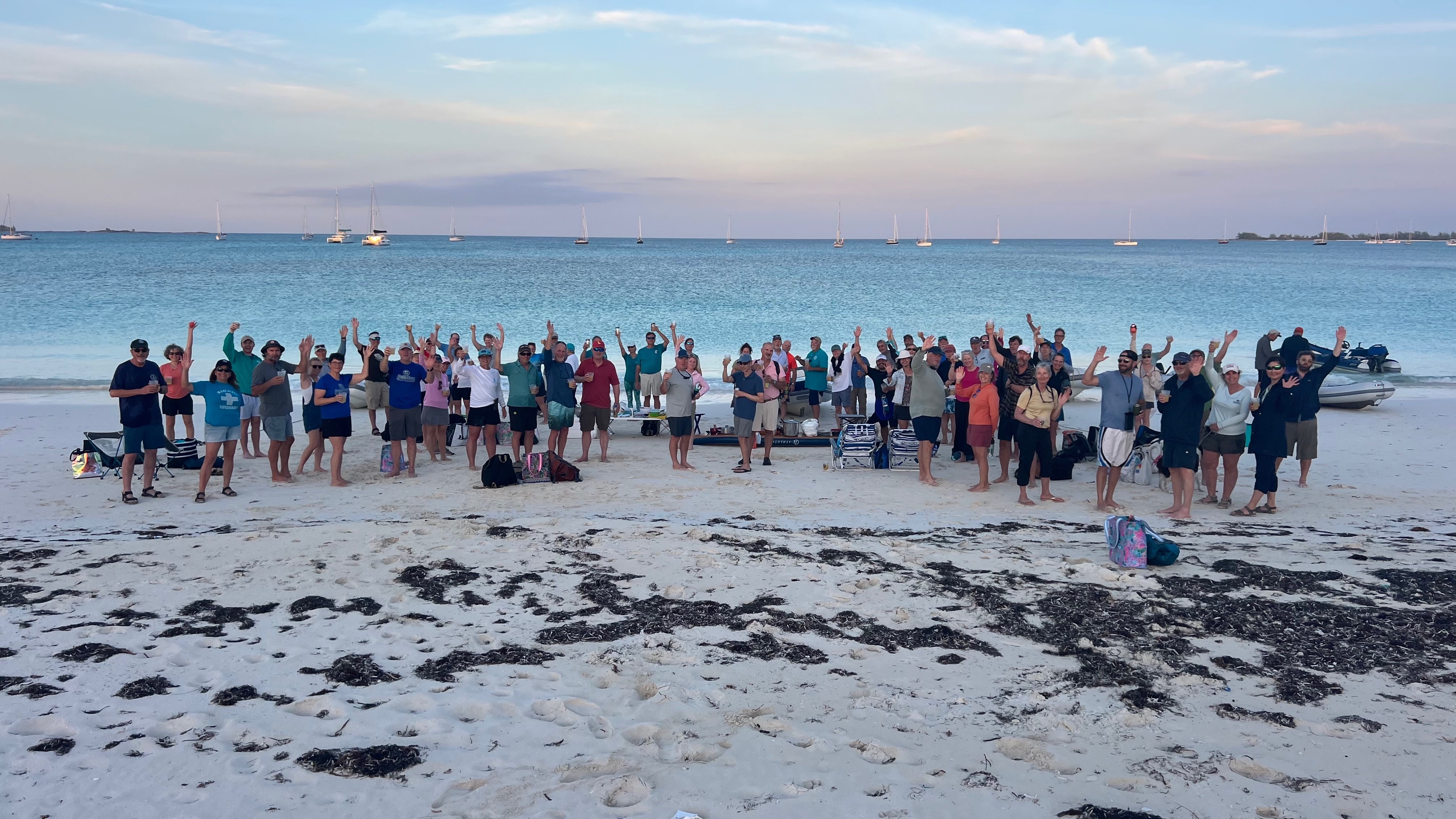 The rally formed a new partnership with the Palm Beach Sailing Club (PBSC) when David Hoy, a member of both clubs, suggested that PBSC could host the Dawgs in West Palm. Commodore Alex Hill, Manager Tim McCain, and Chef James rolled out the red carpet for the Dawgs with a beautiful pavilion on the water. Rally members were able to attend an opening happy hour, several sessions, and a departure dinner. They also enjoyed a special surprise when Matthew Bostrom from Chris Parker’s Marine Weather Center staff joined the rally. Carolyn Shearlock from the Boat Galley and Steve Reoch from David Walters Yachts also attended and offered door prizes! The rally was truly an example of “Sailors Helping Sailors.” Volunteers from Finally, Solstice, Tiger Lily, and Toes in the Water all donned their orange hats and were readily available to answer questions from newer sailors. With a short hop down the coast and a bumpy but manageable Gulf Stream crossing, the boats were off to Great Harbor Cay and a fresh season in the Bahamas!